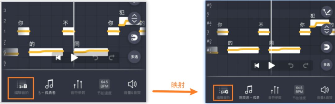 那么接下来,我们需要将这段歌词,调成之前在B调中你看到的音调,“爱”是低6,“你”是低7。对,原来你在B调中“爱”是低6,现在换成G调,你需要将“爱”等后面一大串高朝部分歌词,再一次调到低6等相对应位置完成转调号的操作,你现在“爱”在#低1,这是B调中的低6。