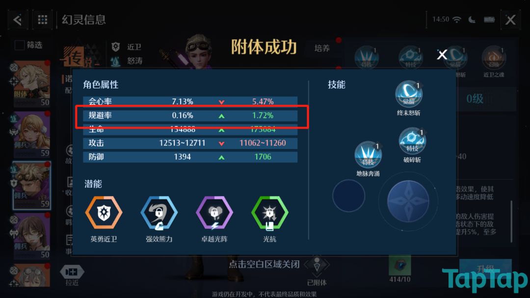 在【英勇近卫】的效果中,有一条“提升力量会获得额外的规避几率加成”这一点,而【强效熊力】增加的属性词条中正好有力量这一点。这也意味着,解锁能力潜能后的诺亚,闪避成功的概率会更高。