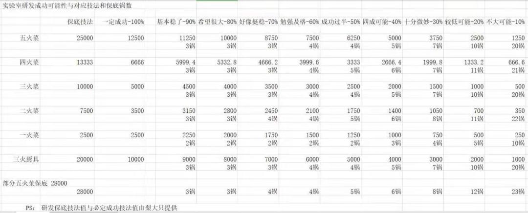 有多余的厨子和符文就可以去研发,那个可能性进度条当累积到两倍的时候就保底一定出。比如某菜必出技法是1000点,你的五个厨师累积技法是500点,那么每次可能性是50%,如果前三次都不出,到第四次研发累积到2000点技法就必出。