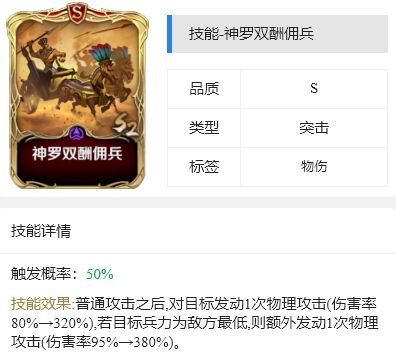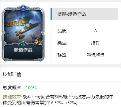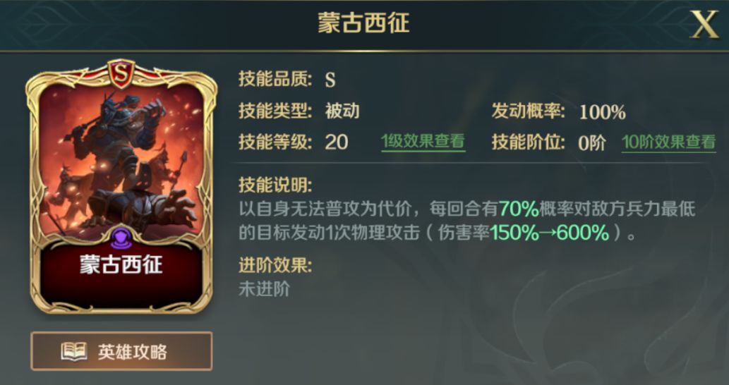 以自身无法普攻为代价,每回合有70%概率队敌方兵力最低的目标发动一次物理攻击(伤害率150%→600%)。
