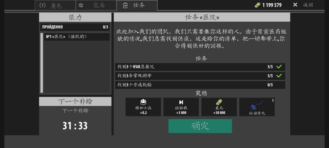 第一个任务IFAK急救包可以在跳蚤市场购买,常规绷带和普通轮胎是医疗绷带和夹板,可以在维和士兵购买过任务方法是随便找个地图把东西丢弃拾取次数足够就可以撤离了。