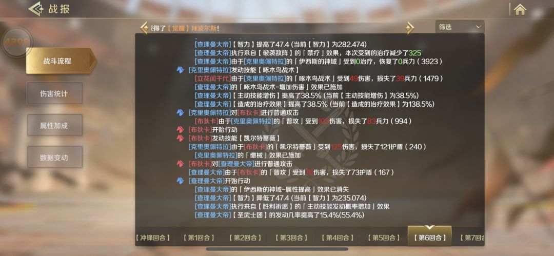 查理曼搭配埃及女,当埃及女主技能给查理曼挂上增属性状态后,到查理曼回合战斗描述说状态消失,那问题来了,在这个回合,查理曼打出来的属性是否算上了埃及女给的buff,有没有真心研究过的来看眼。
