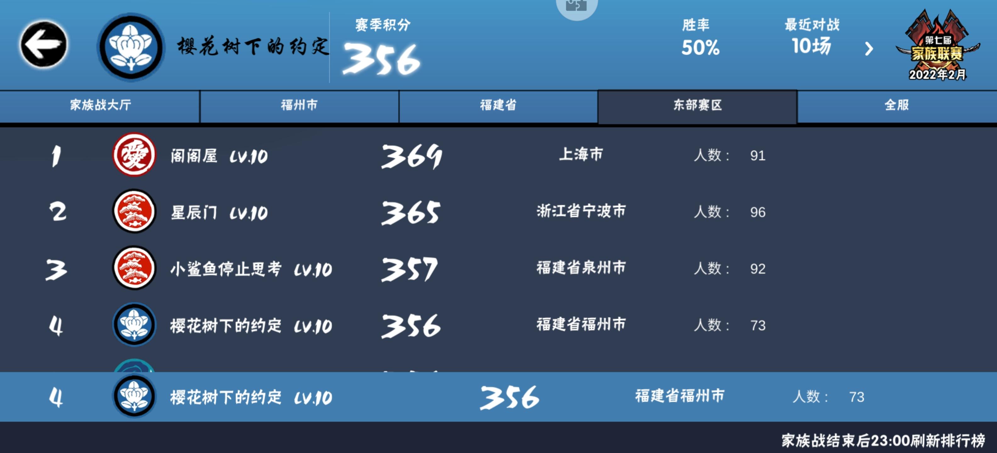 🌸家族介绍:一服,东部赛区,赛区历史最高排名第三名,常驻排名赛区第十左右;