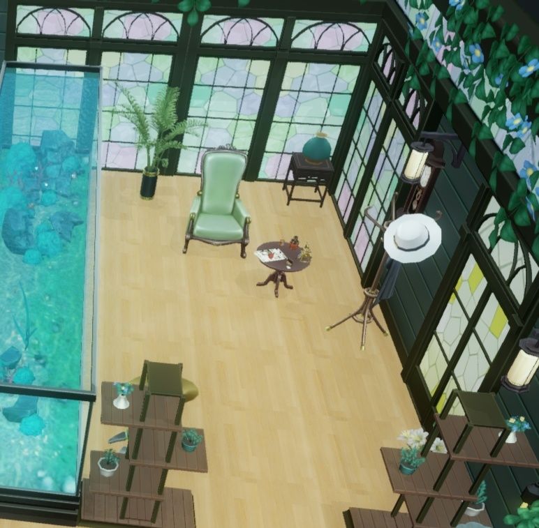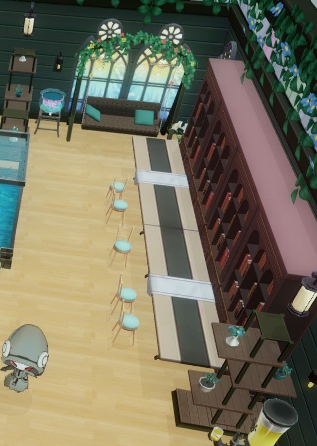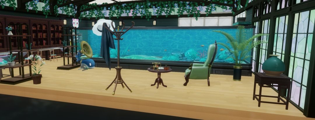 用咖啡厅的桌子遮掉柜子下部分,只显示图书区(就是颜色有点不搭)。然后把椅子摆得乱一点,显得好像有很多人来看书的样子(不排除是卡穆在这里吃零食的)