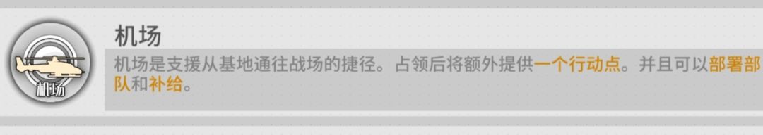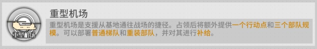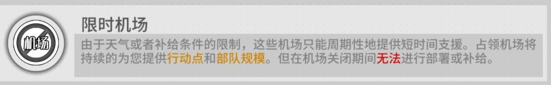 1.限时机场的功能同机场相似,但是无法进行梯队部署/补给/维修等操作。