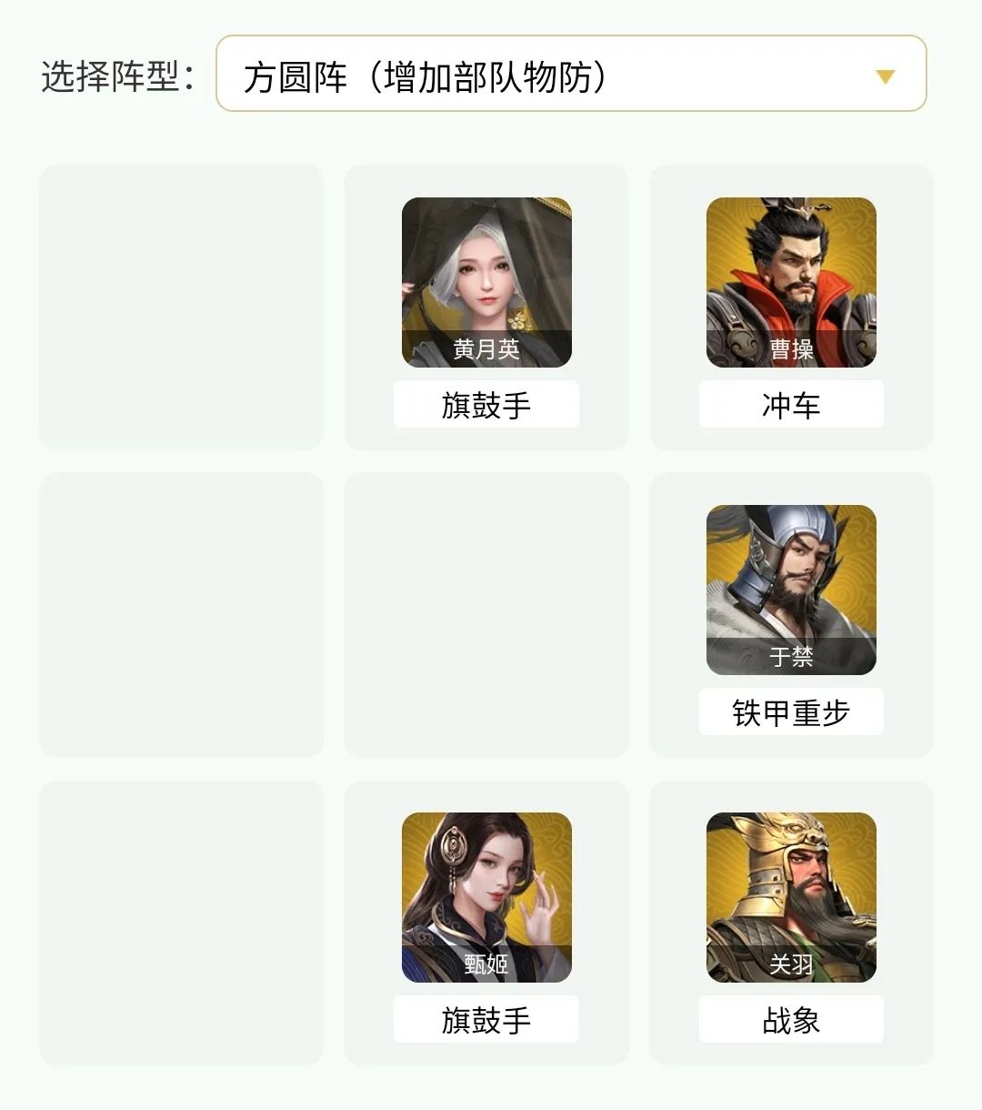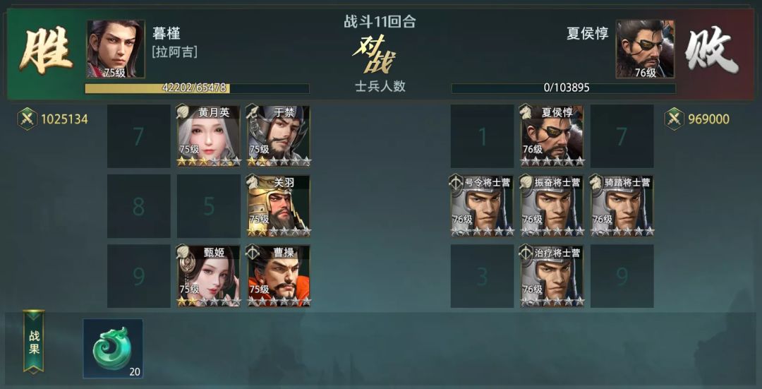 虽然关羽反击能打出更多的伤害,但介于他本身没有更直接的减伤效果,血量上的消耗也不一定很低,此时就需要黄月英这种单体大加的武将来协助群加武将进行治疗,以便让前排的武将兵力稳定。