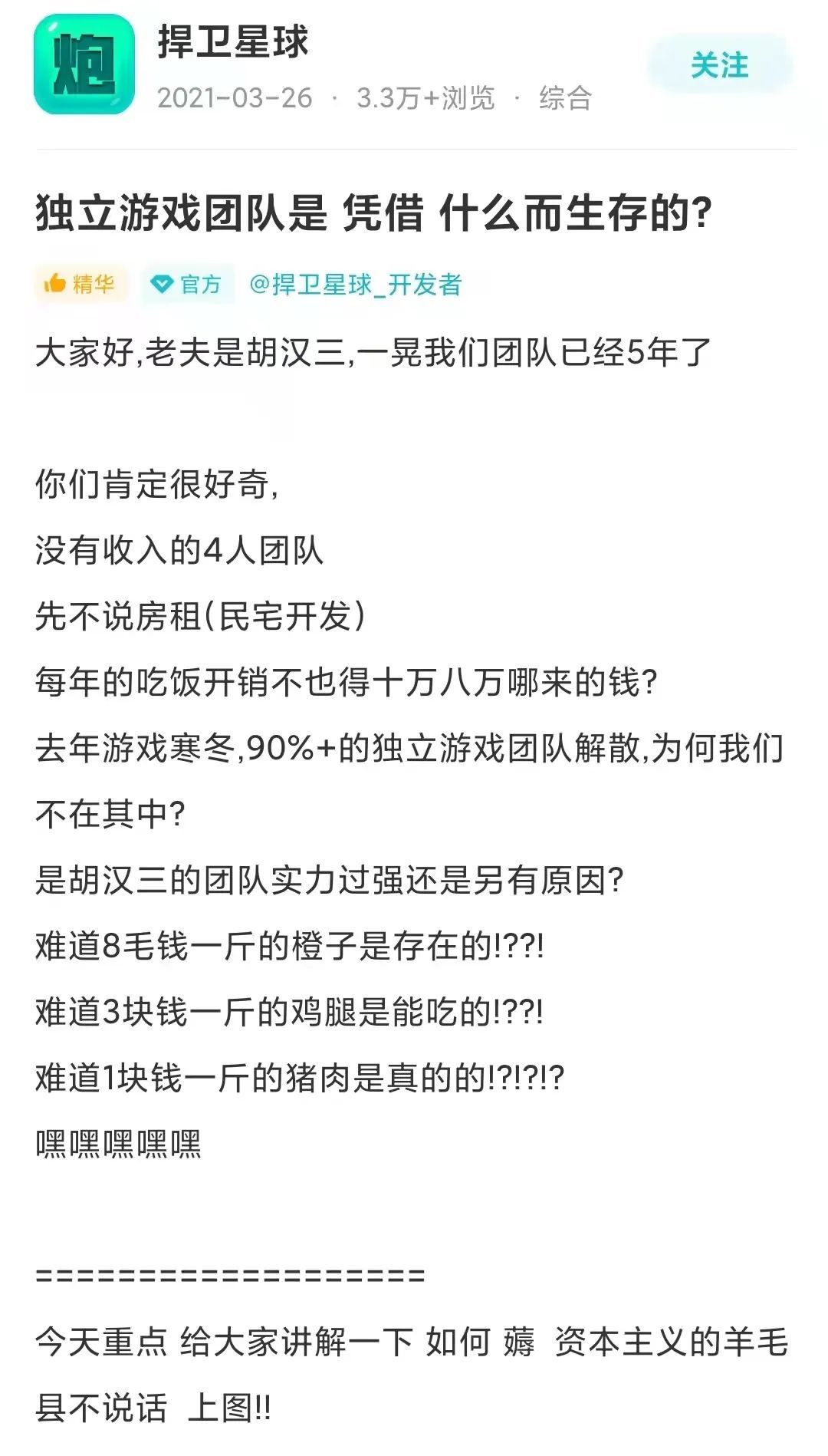 这是一份迟来的开发者“整活”观察,去年3月,《捍卫星球》的开发者在论坛发表了题为“独立游戏团队是凭借什么而生存的”的一篇帖子。最近刷到这个帖子的时候,原本以为是关于独立游戏团队生存困境的内容,但是点开帖子之后看到的内容远远超出了我的想象: