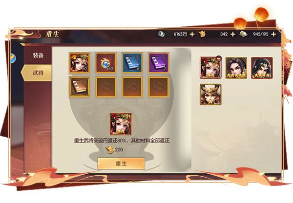 下面说说具体操作,我们在游戏左上角打开“祭坛”-“重生”,即可对没有上阵的武将或装备进行重生。