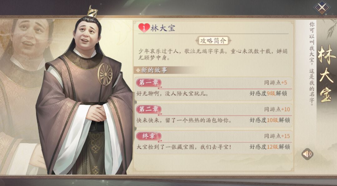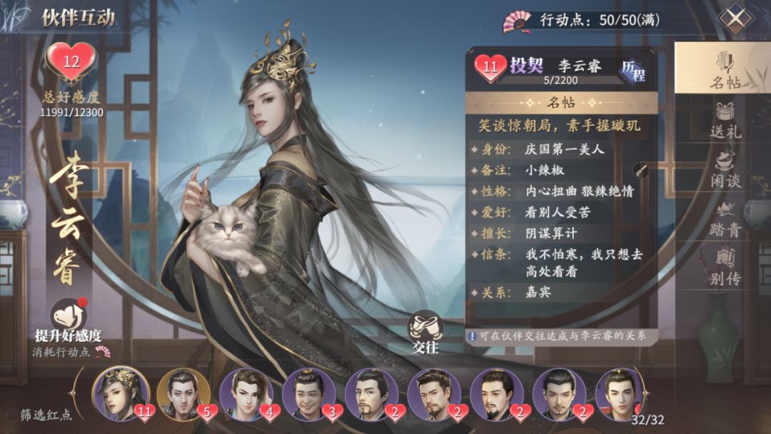 除了闲谈,还能与其一起踏青,去西湖或者去喝茶,聊聊九曲红梅,谈谈蜂蜜杭菊,并可以获得“监察院卷宗”、“京都盛景堪舆图”等道具。攻略玩法则是通过聊天对话,选择正确的选项,来提升默契度。