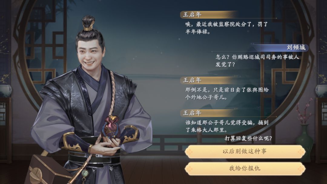 例如我们的老朋友王启年,向他赠送礼物,便可以提升修为和他的好感度,同时闲谈也能够提升好感度。与其聊天时,可以了解到不少好玩的故事。偷偷剧透下,王启年最近因为卖舆图给外地公子哥,而被监察院扣了半年俸禄……