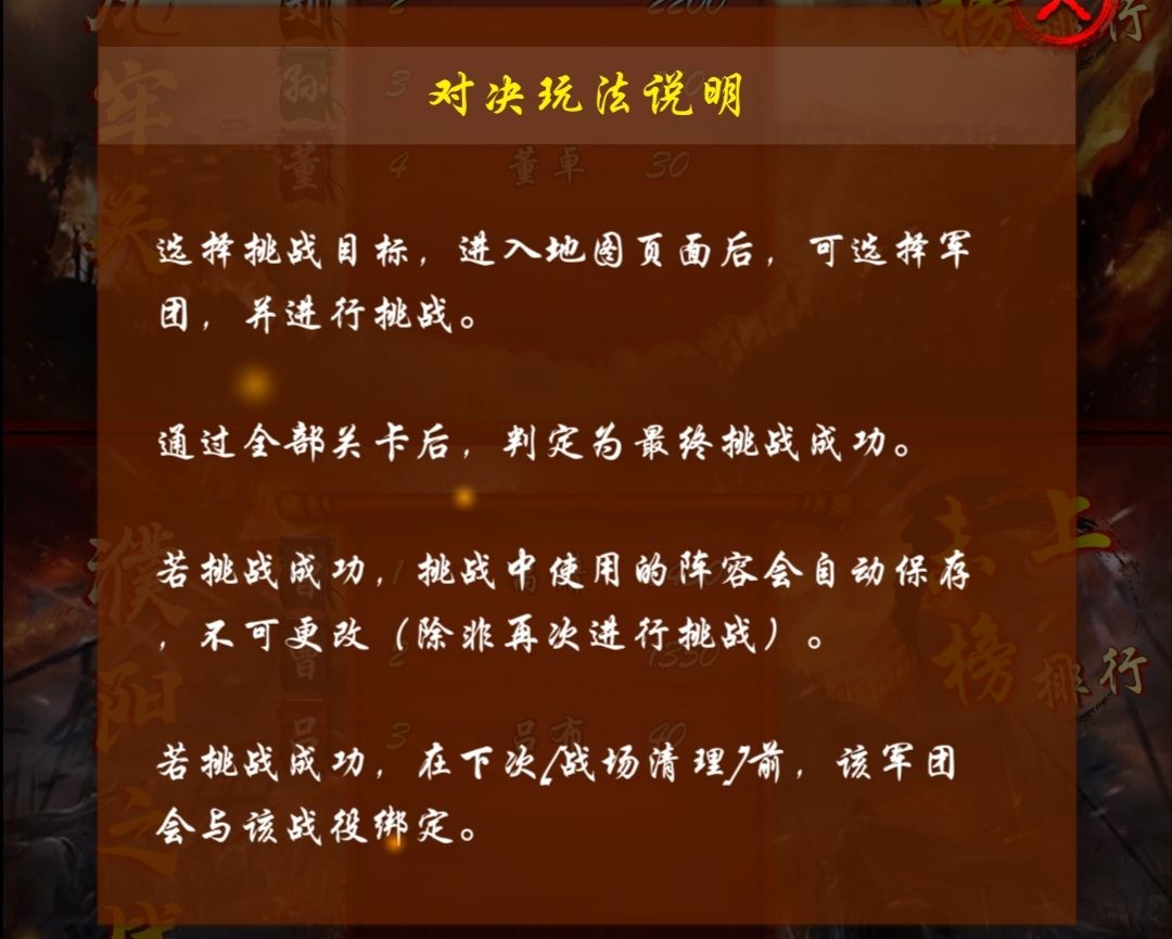 先来介绍一下,对决,日常开的只有三个图,分别是虎牢关(需求人口最多3+3+5=11人口),濮阳之战(需求人口最多3+3+5+7=18人口),官渡之战(5+5+5+5+7=27人口,不过满级也就23人口)。所以这里建议萌新快点升到9级,开曹刘孙三阵营,薅三份对决羊毛。布阵有两点,虎牢关,濮阳之战没什么说的,最后布重兵;官渡之战可以前面布重兵,也可以后面布重兵,不过对于萌新来说,没什么意义,人口太少,不可能面面俱到,所以最高还是最后布下重兵。人口数量限制摆在那里,你布重兵,别人一样可以重兵以对,所以这里建议萌新前面一将偷家,最后一关重兵以对,比较稳妥。