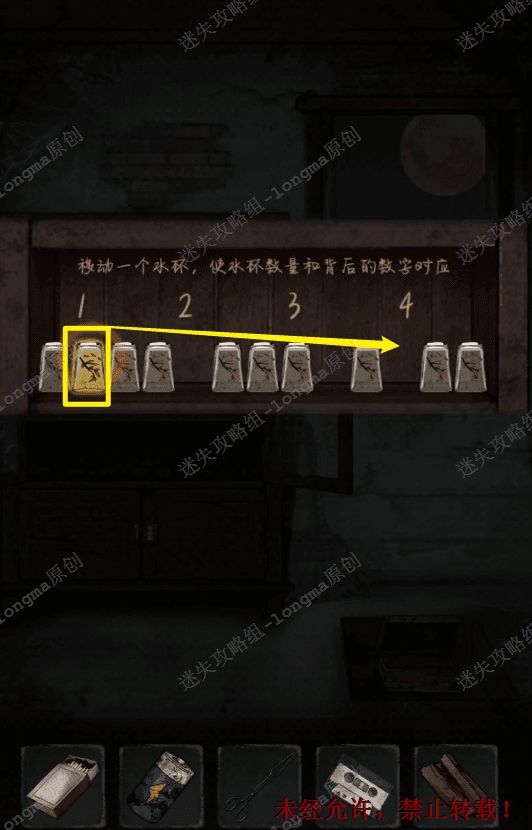 59.向左来到玻璃柜处,使用【辣椒粉】驱赶窗户上的虫子,月光照进来后,打开地上的暗格,根据第二章小索日记本中的线索:木水木金土,打开里面的箱子,得到【磁带】。59