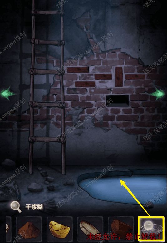 80.移动至有水潭的场景,对照线索纸,依次点击墙上的砖块,打开机关,得到【金元宝】和【小瓷碟】,拾取左边地上的【脸谱】。80
