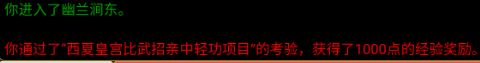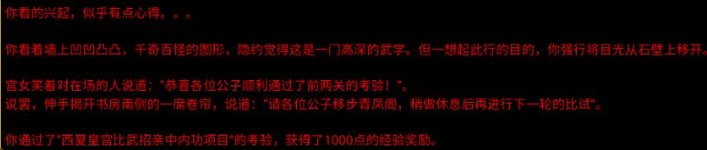来到内书房,诸人纷纷被墙上的武功吸引。手舞足蹈起来,不一会程家洛、胡飞、苗人凰、笛云、原承志、袁官南纷纷软倒昏迷在地,退出了招亲的竞争。此处由基本内功决定是否会软倒昏迷(导致任务失败)。