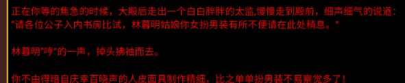 请各位公子入内书房比试,林暮明姑娘你女扮男装有所不便请在此处稍息。