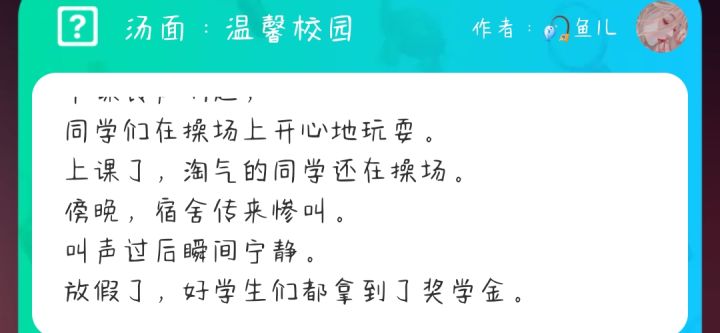 今天推荐的海龟汤是“温馨校园”,光听名字,大家会不会觉得这是一个温暖的或者感人的故事呢,但其实这是困难级别的恐怖本