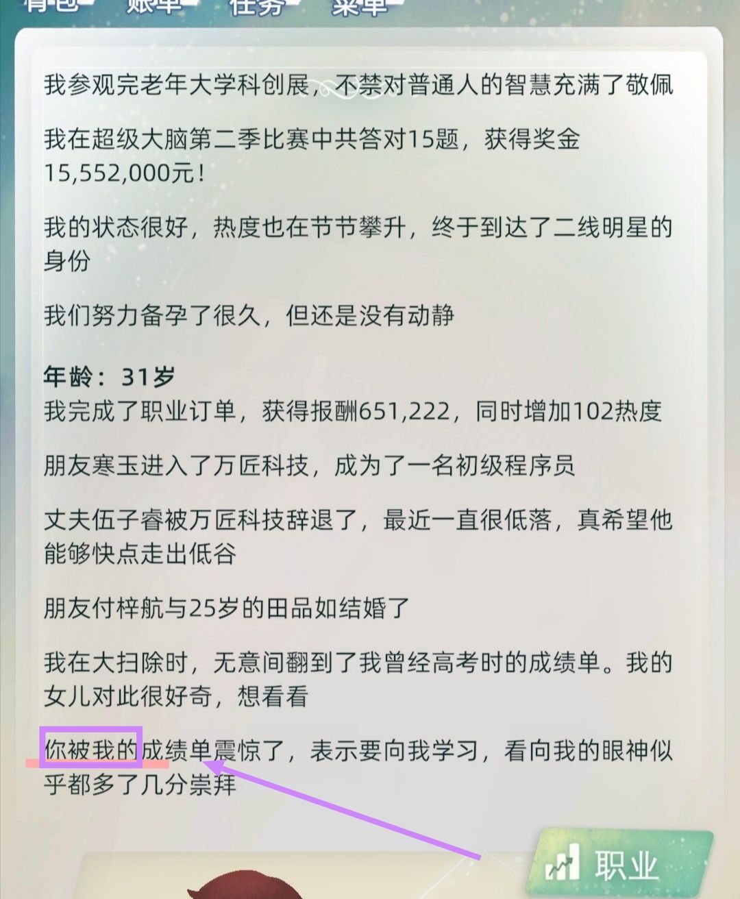 最后,贴一个遇到的文案怪怪的,感觉应该是文案显示有误。图中紫色框的地方“你被我的成绩单惊呆了”,应该是“女儿被我以前的成绩单惊呆了”或者是“xxx被我以前的成绩单惊呆了”。