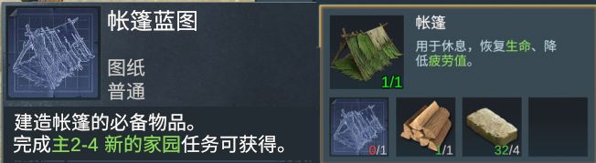在完成主线2-4 新的家园后,你就可以获得帐篷的蓝图啦!收集好要求的材料就可以搭建属于你的海海岛温馨小帐篷~对了!根据帐篷等级的不同,每次可以恢复的生命、降低的疲劳值都有所不同哦!