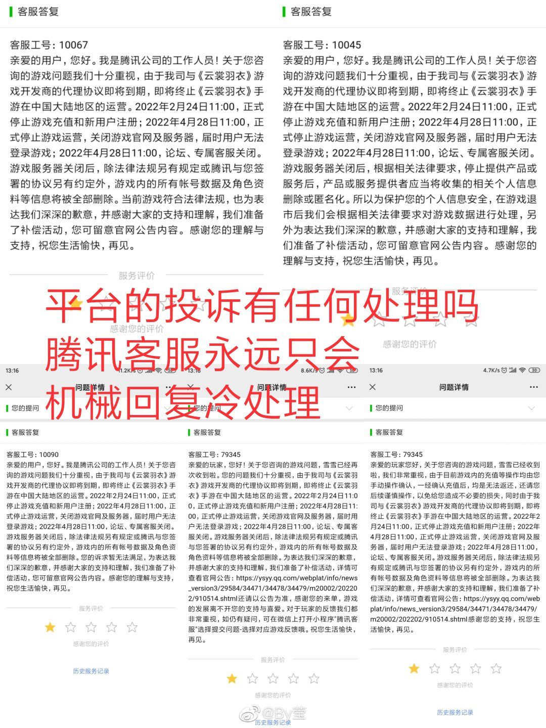 腾讯和西山居的游戏【云裳羽衣】开服时多次宣传不删档,现在却关服删数据,实属虚假宣传。关服前出长期返场活动,误导消费者该游戏短期不会关服,消费者为此充值。关服补偿方案违反【关于加强网络游戏虚拟货币管理工作的通知】第十一条,即不是退还法定货币也不是消费者同意的保留数据离线单机版,而是引流其他游戏的游戏礼包补偿,霸王条款只能选择接受,不接受则视为放弃,侵害消费者的消费选择权,变相强制消费,诱导引流消费者去其他游戏。多次在腾讯平台投诉,得到的只是统一话术回复,腾讯和西山居对消费者的权益视若无睹,侵害消费者权益,请正视消费者诉求❗❗❗❗❗❗❗❗❗❗❗❗