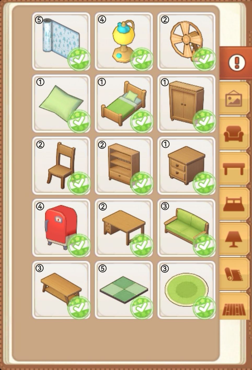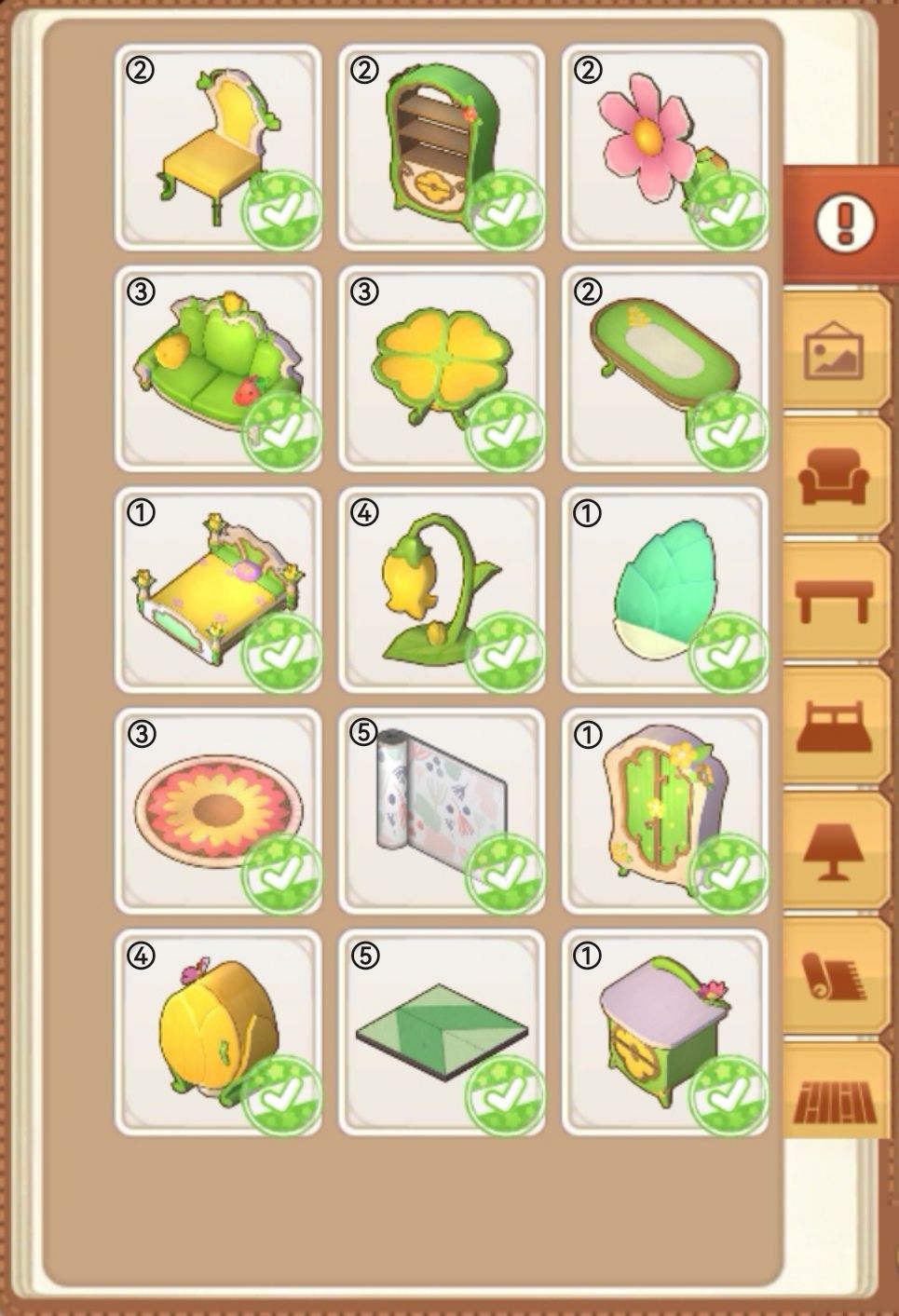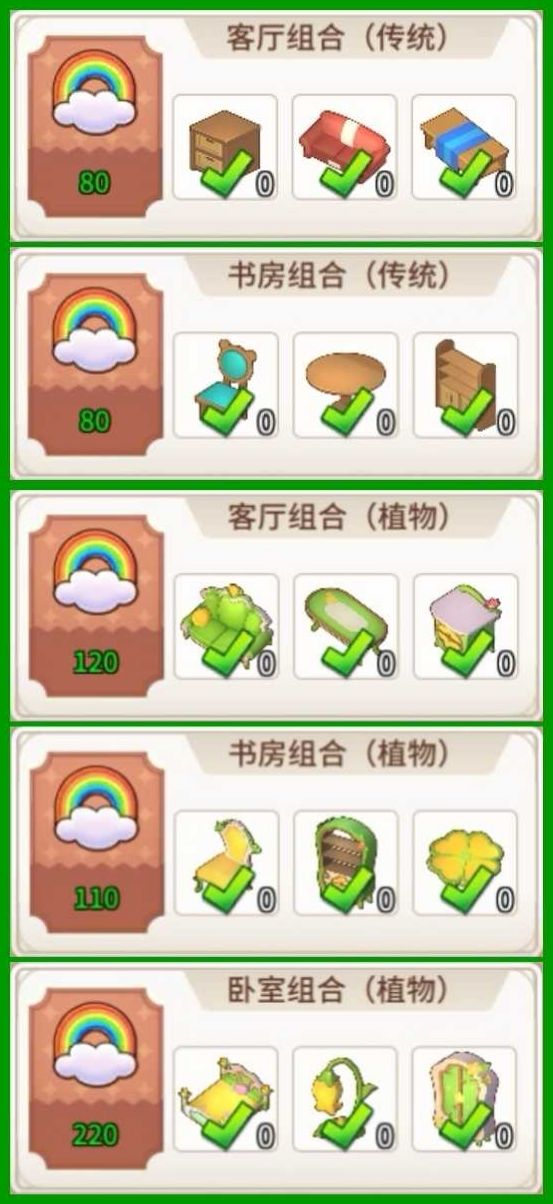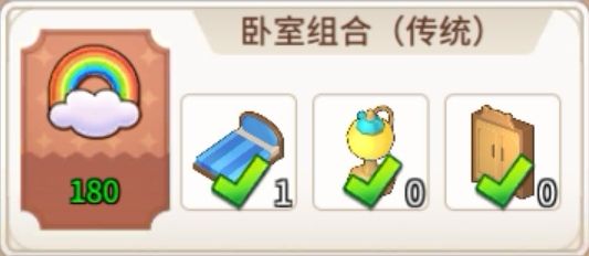 PS:有个别家具是限时活动获得的,可以用其它不重复的家具替代!另外,还有一套组合家具并没有使用,由于这组合的床是新手教程村长送的,仅此一件,其中有一件灯具也是2-1客房指定需要的,若想要使用这个组合家具,可以考虑考虑,这组合家具如下图所示: