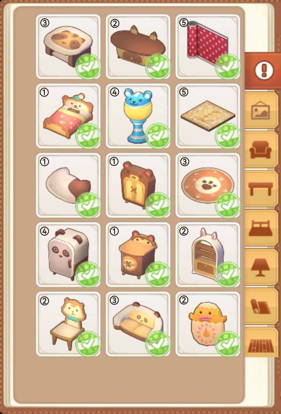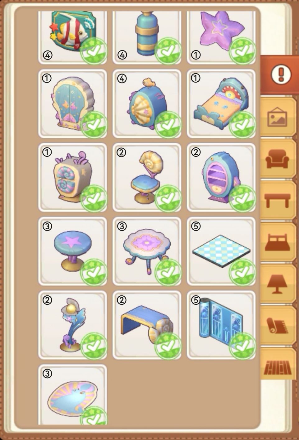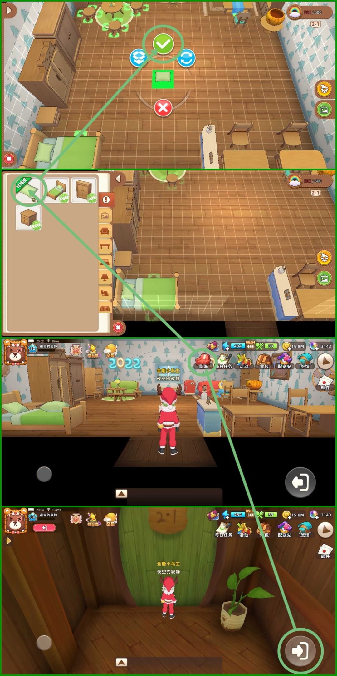 PS:有个别家具是限时活动获得的,可以用其它不重复的家具替代!另外,还有一套组合家具并没有使用,由于这组合的床是新手教程村长送的,仅此一件,其中有一件灯具也是2-1客房指定需要的,若想要使用这个组合家具,可以考虑考虑,这组合家具如下图所示: