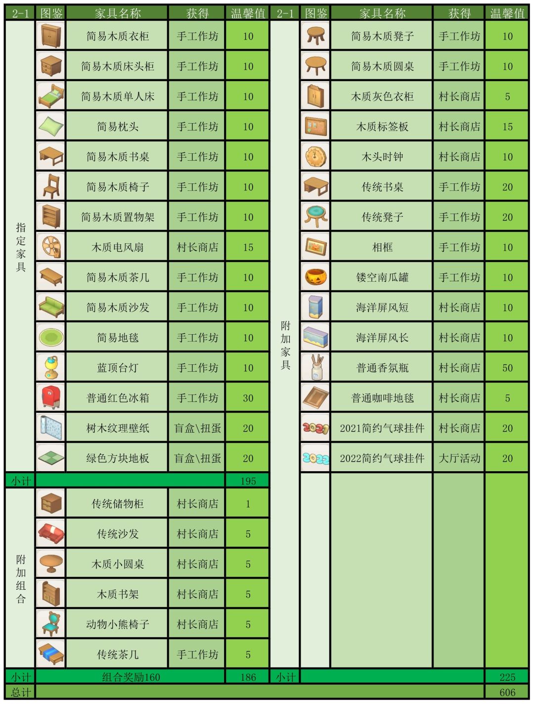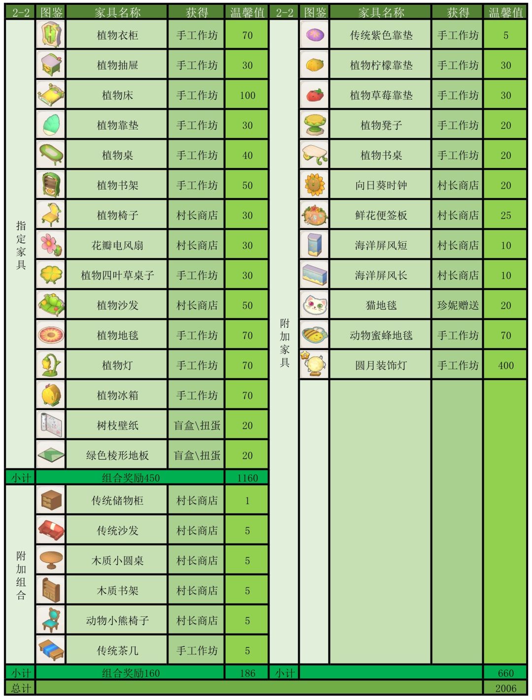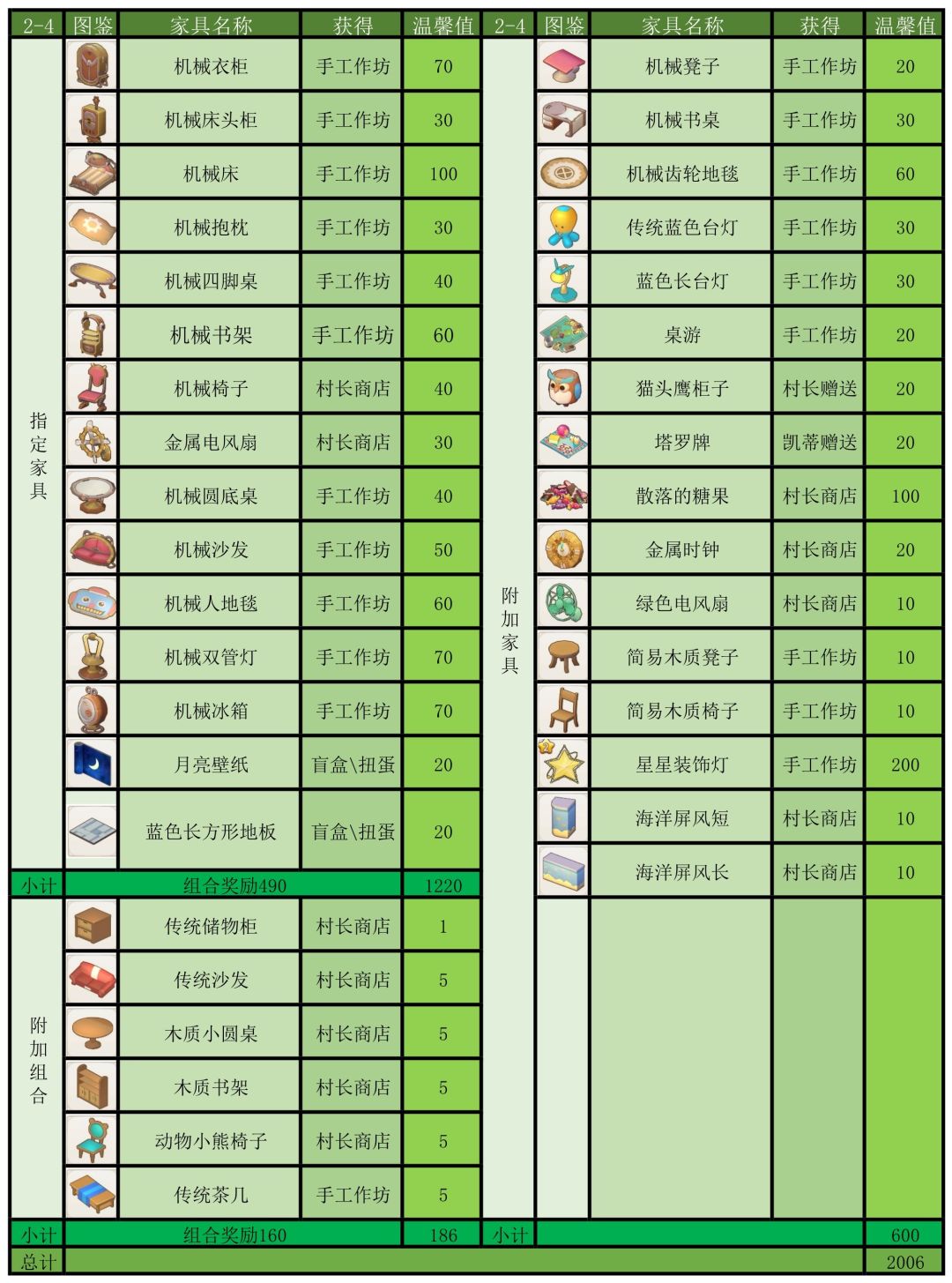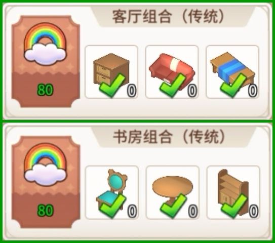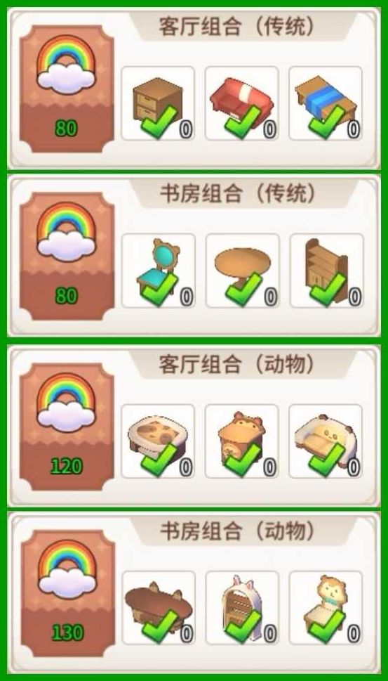 温馨建议:客房的温馨值不够的解决方法,简单来说就是堆家具,只要在同一间客房里面不重复的家具都能叠加,并且组合家具额外奖励在旅馆里也有效,组合家具的温馨值是三件家具自身数值加上奖励数值,若有强迫症患者可以参考我的家具清单对症下药,保证看着很顺眼,温馨值不多,就多6点,为啥?因为组合家具,这样省钱又划算,可以先试试看下图: