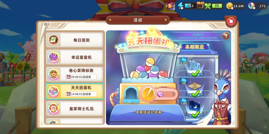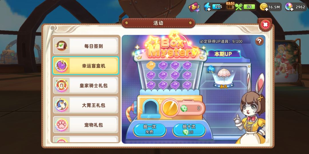 ②在“活动”里面的“幸运盲盒机”抽奖获得,这个盲盒机常驻活动里面,每天“首次免费”,只能用珍珠购买绿色的“盲盒机代币”进行抽奖,除了右侧“本期UP”永久物品之外,也能抽到其它永久物品(全品类随机),并且UP有保底机制了,累计“99/100”之后,在第100次百分百获得本期UP,但是“免费”不会累计保底次数!