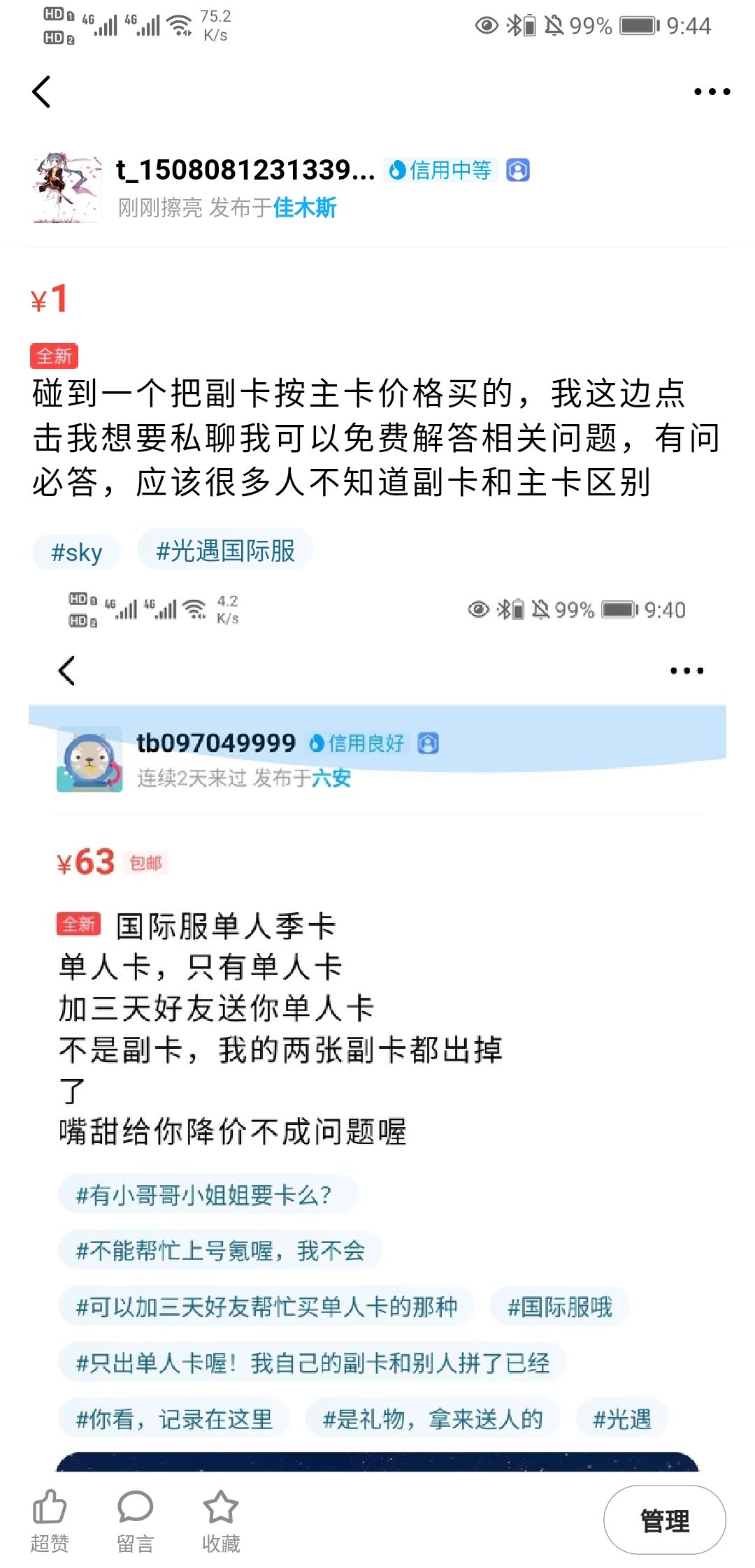 我代氪赚钱?抱歉那些是我随缘挂的,平台自动冻结3天我当然不走平台你能看到我卖多少?我压根不靠这玩意活,只是看你明明就是副卡非得骗人说不是副卡不爽罢了,您继续骗,我不打扰了,不敢你多少买的不管你有没有收据,送出去的卡就是副卡,麻烦您先自己分清