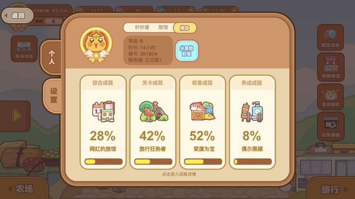 旅馆:旅馆我建议升到8级先,优先性放在农场后面,升到9级所需资源过于庞大,不如先操作每日温泉以及探险。温泉相当于猫猫全撸一遍,猫越多越赚;探险可以换一些抽猫的资源,帮助度过前期无猫可用的局面。