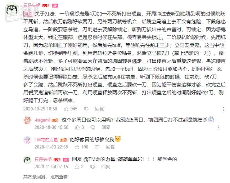 这时候的观众可能万万没想到,失明不仅想教会你打怨恨之鬼,在一年后,他甚至还试图分享自己钻研出的万字长文,教会你怎么和他一样,闭着眼睛通关《只狼》。