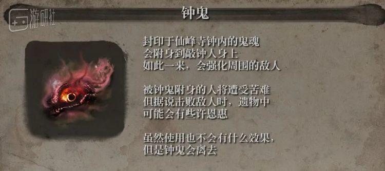 钟鬼是在游戏前期玩家就会遇到的一口大钟,只要敲击一次,就会让游戏难度整体提升一层,让所有敌人的韧性加强,同时让敌人更容易打崩你的架势,揍你伤害更高,是大多数玩家高周目为了挑战自己增加难度才会使用的BUFF,没看说明的失明对这一切并不知情。