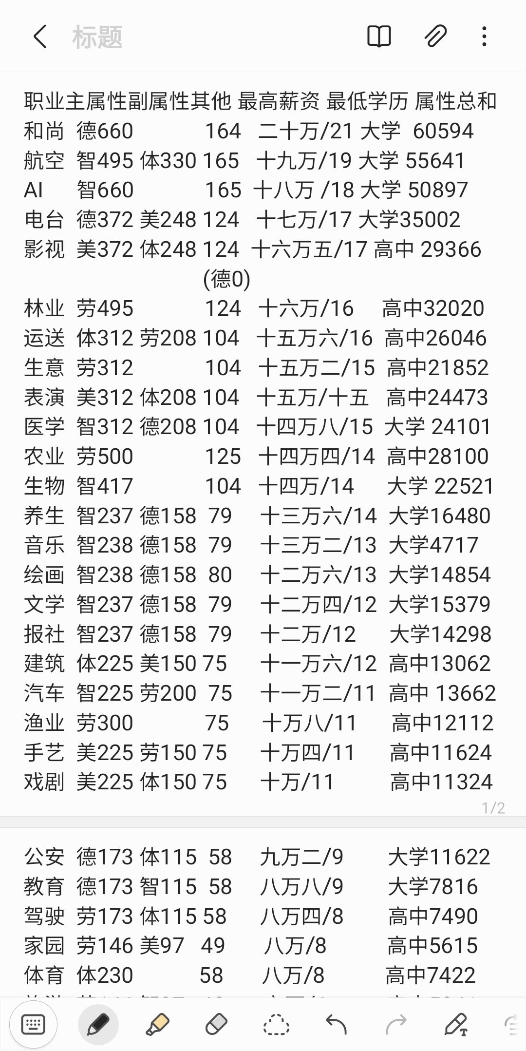 这个游戏目前总共31个大的职业类别 ,里面又分好多个不同阶段的职业 ,而每个职业都和你受教育的属***息相关。 为了让大家更好的、 更有规划的选择课程 我弄出了这两张图 。主副、其他属性指的都是满足要求的最低属性,有些职业没有副属性。大家可以按照自己喜好选择职业进而规划课程。并不是最高薪资越高越好,薪资越高需要学历越高 ,属性要求越高 ,你的时间成本越高 。前面几个高薪资的职业感觉都是给大氪佬准备的 因为我没有参加过内测不知道初中高中课程增加属性点的情况,这只是我一家之言。手边没有电脑 都是手机一点点打出来的攻略 希望大家看完点个赞呀!