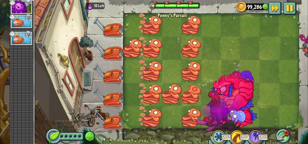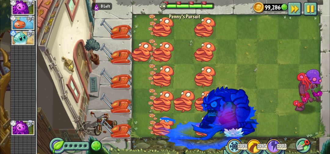 慢慢拖的时候到了,只能靠一次性植物消耗了。(还有一张刚好冻住巨人敲下来一瞬间的截图)