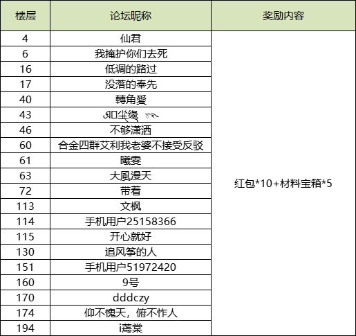 恭喜以上几位主公获得小R送出的“红包*10+材料宝箱*5”。奖励会在此贴公布后七个工作日内发送到主公的邮箱内,请注意查收!