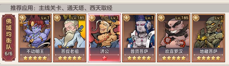 佛域均衡队:不动明王、菩提老祖、济公、普贤披萨、欢喜罗汉、地藏菩萨