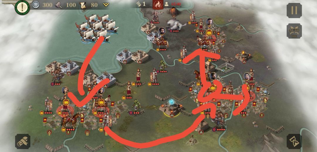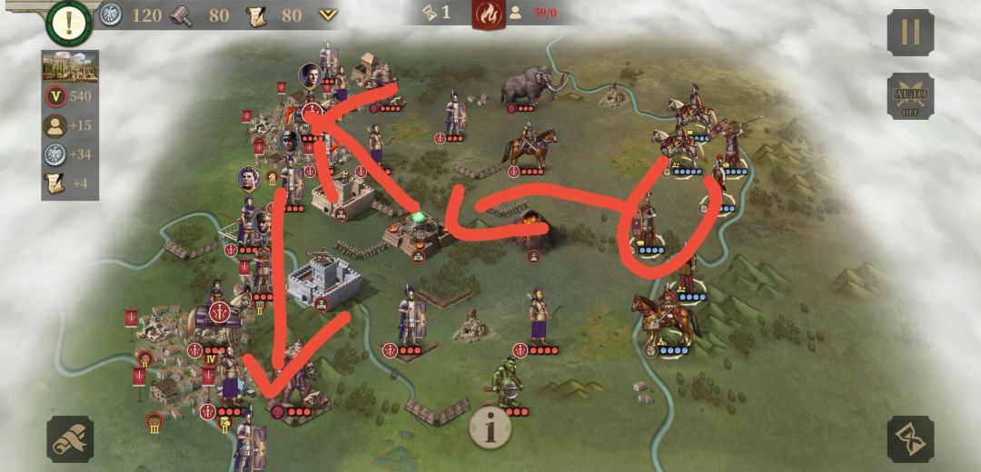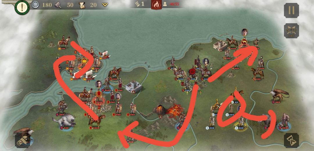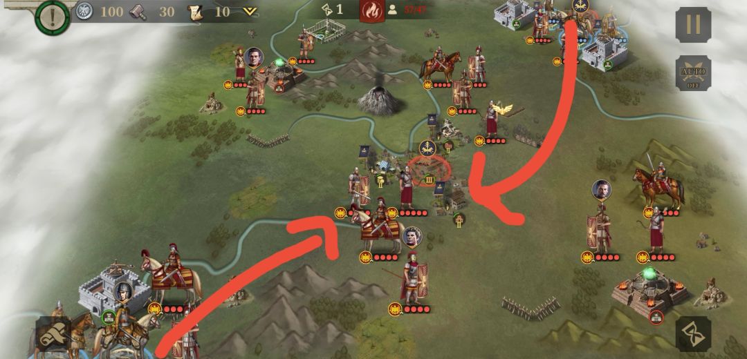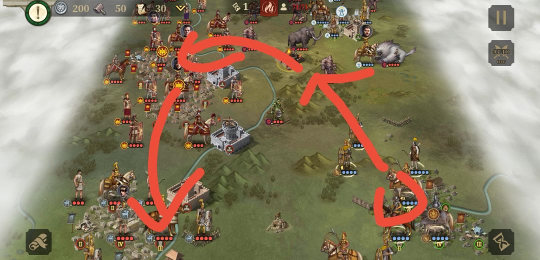 上岸的时候快,跑祭坛旁的要塞可以把凯撒勾引出来,攻城骑指是主力;记得攻完汉尼拔的城后补充骑指的兵源;左下会是祭坛攻击的重点,需要用小兵堵住;庞培可以先不攻击,在距离较近的地方勾引出来;