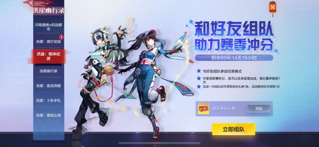 3月24日至4月7日期间,与好友组队战斗即可加入“洪崖:相伴纪游”活动,参与即送炫彩礼券,活动期间组队可享受联赛积分、金币以及亲密度加成!