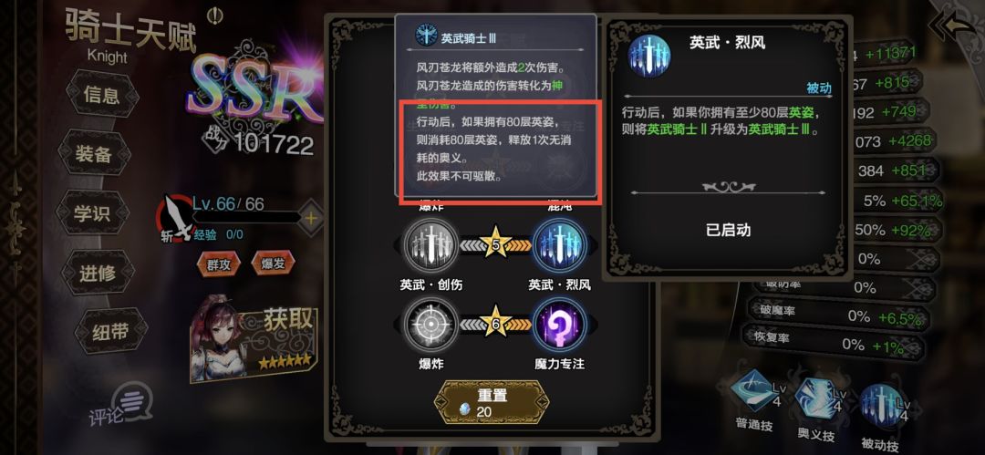 关于英武骑士通俗说明:艾露莎可以达到三个状态,即英武骑士1、2、3,状态越高伤害越高。进入英武骑士1需要25层英姿,进入英武骑士2需要50层英姿,进入英武骑士3需要80层英姿。英姿的获取来源是暴击,所以暴击越高可以使艾露莎更快进阶,经本人实测一场pvp艾露莎是可以进阶到英武骑士3的,而且这个状态下非常猛了。
