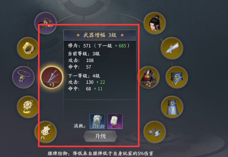 在腰牌进阶后,可以解锁装备增幅功能,在装备增幅的效果可以提升角色已穿戴的对应部位装备的百分比属性。装配增幅需要消耗监察院密令以及玉牌。