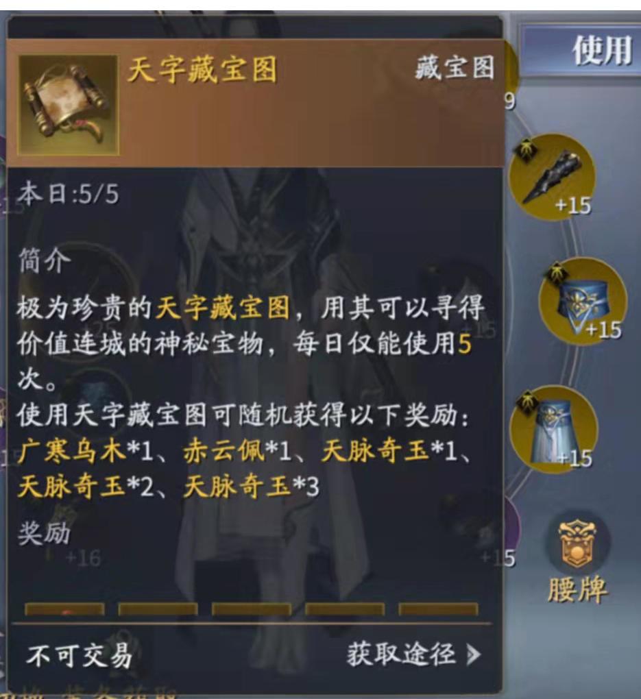 使用天字藏宝图后会在挖宝地点刷出一个盗宝怪物,将其击败可以随机获得珍贵掉落,比如大量增加伙伴等级的赤云佩、打造红色赤霄装备必备的天脉奇玉、广寒乌木等等,如果自己对装备没有需求的话,拿到集市售卖也是个不错的选择。