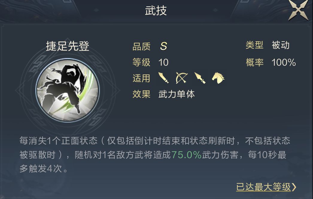 SP孙尚香的技能有着极强的限制能力,长达30秒的多目标沉默能让许多主动队伍望而生畏,并且在沉默失效时还会额外触发一次高AOE伤害。所以这名武将既可在担任辅助时补充输出,也可在担任输出时补充队伍控制,能明显减少阵容的搭配压力。因为她的武力、攻速成长都比较优秀,技能也无特定限制,能搭配到各种体系,本期为大家推荐的是捷足体系。