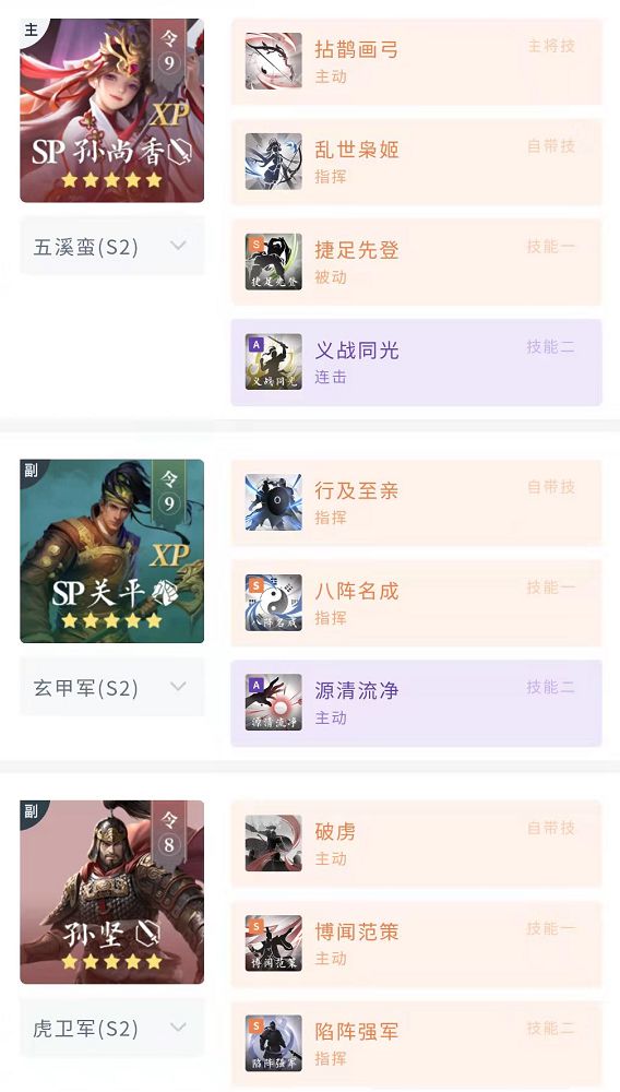 捷足体系的核心在于高频增益刷新,同时单核队伍需要稳定的增伤加成,关平的高额增伤非常适合搭配单核主将,属性成长也能很好的预防八阵名成,之后源清流净+博闻的双重触发能保证大量增益来源和净化。第二副将推荐孙坚,他能为香香提供连携加成,并能使用陷阵强军,主公也可以尝试搭配下其他步兵武将。