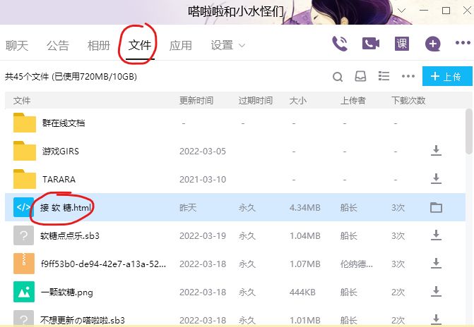(文件放在了“嗒啦啦和小水怪们”QQ群里,点击文件找到“接 软 糖.html"下载就可以了!)