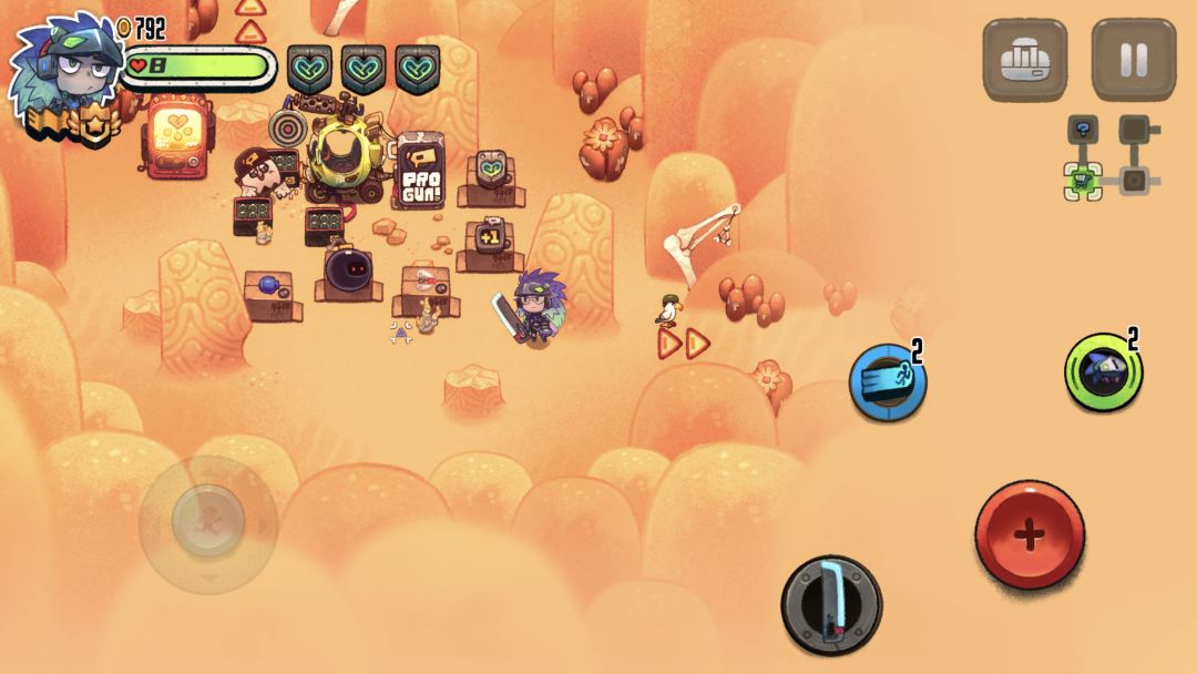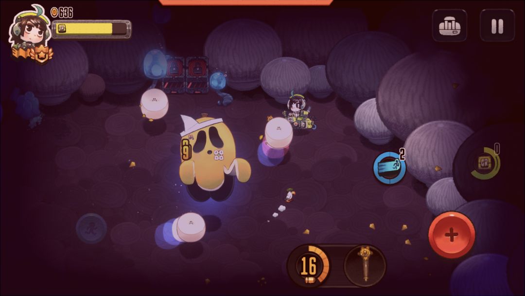 怪物关卡设计我体验最深。在怪物方面,有埋藏在地下的移动刀兵,有子弹三连发的炮兵,还有成群结怪的西瓜小兵。在小小的手机屏幕上,我不仅要操纵角色打死这些小怪,还要不停变换走位,以防被这些小怪消耗掉血量。第一关最后的boss开始有清屏激光,我开始无法直接打死boss,得想办法引爆地图上的蘑菇炸弹眩晕掉boss才能造成伤害。