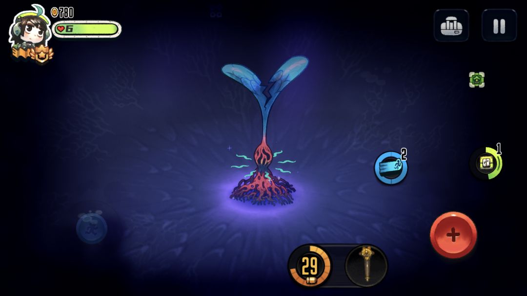 接下来重点说一说游戏的玩法,游戏采用的是rougelike 模式,玩家需要一边凭借着走位和手法,进行刷图;一边依靠着自己的运气,收集宠物,或者是装备和buff。当然,与大多数rouge游戏相同,《恶果之地》也有着诸多的角色以供选择,不同的角色有着不同的能力,比如托克拉的精力恢复的特别快,大招是召唤影分身,这就让该角色多了许多的机动和应变玩法;相反,阿尔法的精力条恢复的比较慢,这也意味着这个角色没有那么强的机动力,但他却拥有着复活一次的机会与召唤一个豌豆射手帮忙输出的技能,缓解了自身弱项的缺点。这些角色上的设置,也让我在游戏的过程中,可以通过自己的习惯和喜好, 选择如何进行刷图。