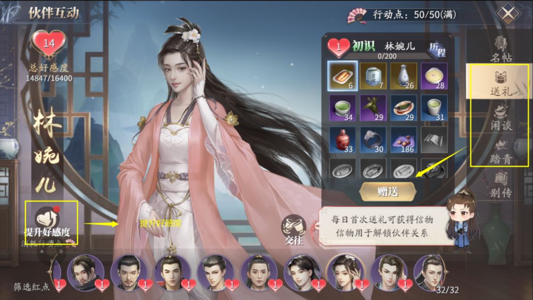 与好友结识后,通过闲谈、踏青、赠礼等行为,便可与他们增厚情谊,增加好感度。每一位挚友的别传开启,都有着对应的好感度要求。若想与各位好友更深了解,便需要悉心与之交往,直到好感度到达10级。