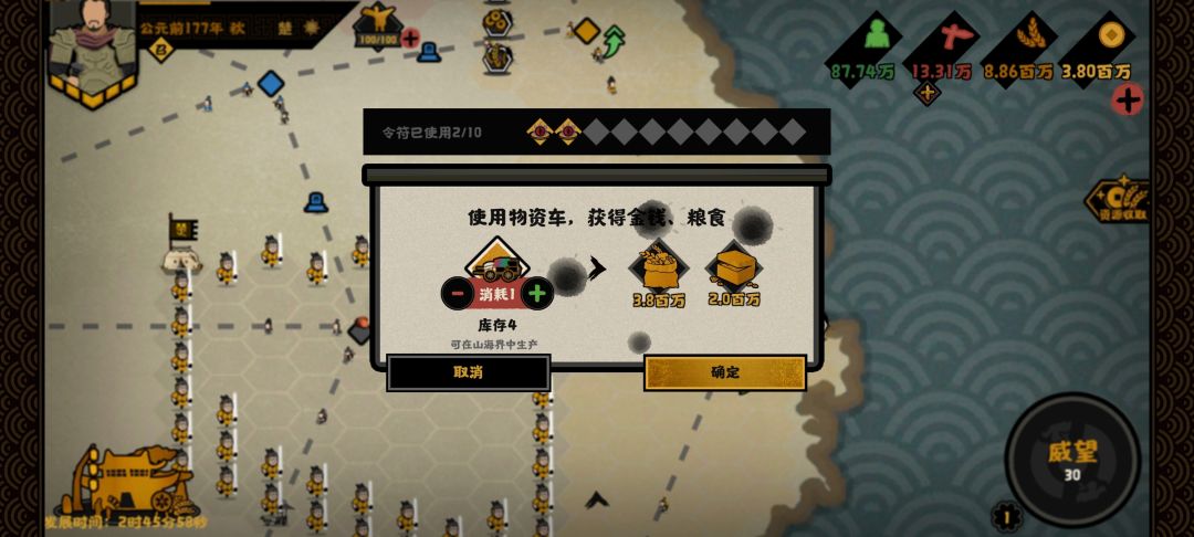 物资车:所有道具中使用最频繁而且对新手最友好的道具 ,能够瞬间获得大量粮食与金钱,并且不会产生烛龙之眼中军队与居民的产出。因此不需要担心军队瞬间暴涨引起的军费开支所导致的财政赤字问题,前中后期都可以使用,但是由于物资车的珍贵性,所以一般用于前期。
