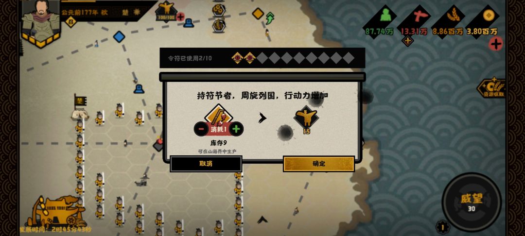 外交符节:获得15点外交行动力,外交行动力主要可以用来进行贸易以及拜访用间等活动,一般广泛应用于春秋战国及秦楚汉时期,主要是在前中期使用,后期外交点基本用处不是很大。