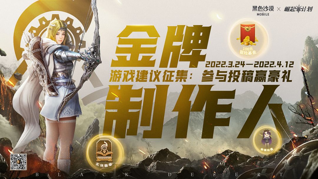 现在,游戏经验丰富的你,只要写下你对《黑色沙漠手游》的游戏建议,无论是系统设计方面,还是功能体验方面,都是可以来参加我们的【崛起计划】金牌制作人招募活动!