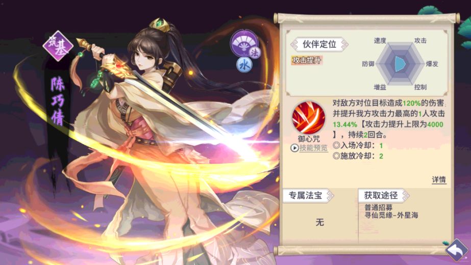 来到第二章主线剧情任务,道友们会通过普通招募抽取到第一个伙伴——师姐陈巧倩,并且会在此章主线剧情任务中解锁炼器玩法,可以通过炼器方式打造制定法宝,每种法宝均有不同的技能效果,合理搭配在适合的伙伴上还能够达到事半功倍的奇效,极大的提升战斗力。
